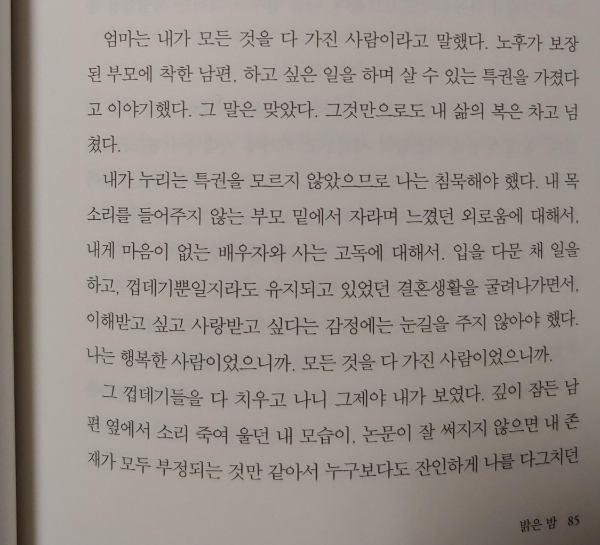 『엄마는 내가 모든 것을 다 가진 사람이라고 말했다. ~ 나는 항상 나를 몰아세우던 목소리로부터 거리를 두고 그 소리를 가만히 들었다. 세상 어느 누구도 나만큼 나를 잔인하게 대할 수는 없었다. 그래서 쉬웠을지도 모르겠다. 나를 함부로 대하는 사람들을 용인하는 일이.』